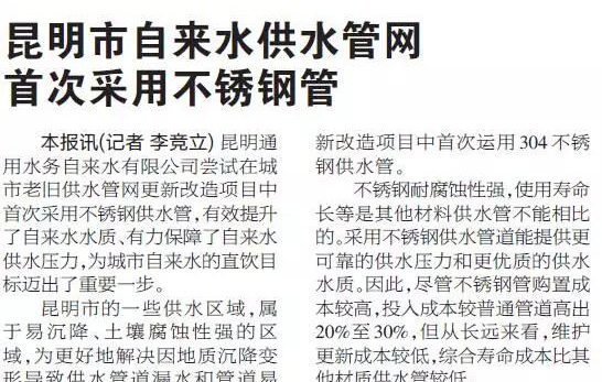昆明自來(lái)水供水管網(wǎng)首次采用304不銹鋼薄壁水管