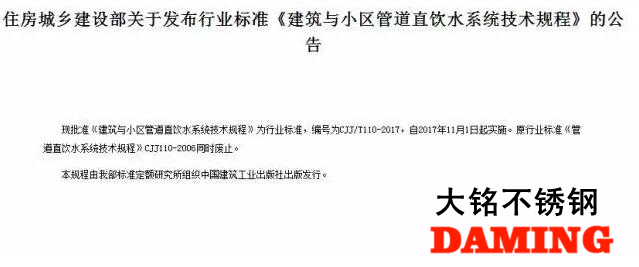 此外,近期住房城鄉(xiāng)關(guān)于發(fā)布行業(yè)標(biāo)準(zhǔn)《建筑與小區(qū)管道直飲水系統(tǒng)技術(shù)規(guī)程》的公告:批準(zhǔn)《建筑與小區(qū)管道直飲水系統(tǒng)技術(shù)規(guī)程》為行業(yè)標(biāo)準(zhǔn),編號為CJJ/T110-2017,自2017年11月1日起實(shí)施。規(guī)程中規(guī)定:管材應(yīng)選用雨花區(qū)304不銹鋼薄壁水管、銅管等符合食品級要求的管材。一系列跡象表明,不銹鋼水管時(shí)代正在到來。