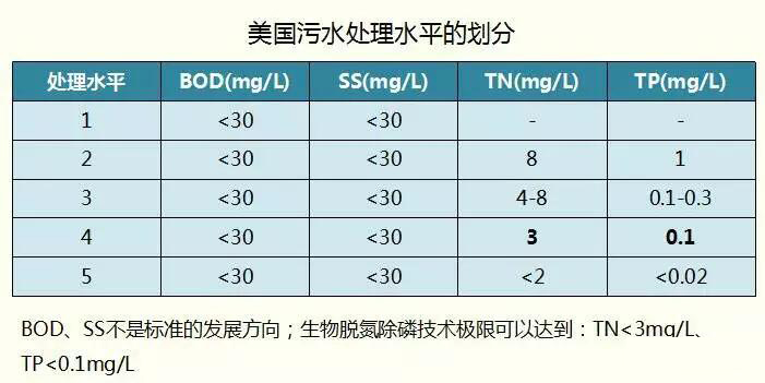 這是美國(guó)污水處理的水平分級(jí),各級(jí)的BOD、SS沒(méi)變,只有氮磷在變。