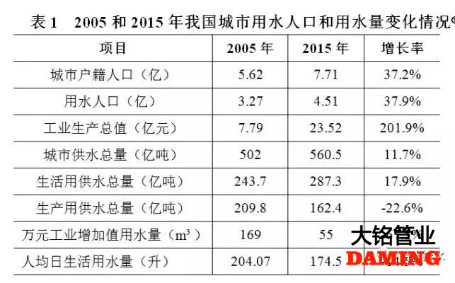 2005~2015年期間,城市戶籍人口、用水人口數(shù)量和工業(yè)生產(chǎn)總值大幅度提高,城市供水總量僅增長了11.7%。同期,萬元工業(yè)增加值用水量下降了67.5%,人均日生活用水量降低了14.5%,生產(chǎn)用供水總量下降了22.6%,生活用供水總量僅增長了17.9%(見表1)。