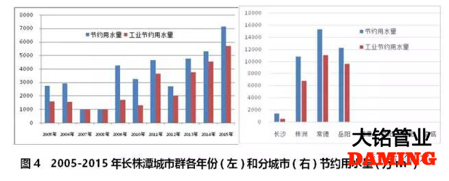 長株潭城市群2005-2015年期間,節(jié)約用水量從2013年一年呈增長趨勢,70%的節(jié)約用水來自工業(yè)部門(見圖4左)。該城市群沒有一個城市對節(jié)約用水?dāng)?shù)據(jù)進行連續(xù)統(tǒng)計,湘潭、益陽、衡陽和婁底四個城市則完全沒有節(jié)約用水統(tǒng)計數(shù)據(jù),株洲、岳陽和常德三個城市節(jié)約用水量占城市群節(jié)約用水總量的99.6%(見圖4右)。事實上,長株潭城市群2003年至2011出現(xiàn)了嚴(yán)重的缺水狀況,已經(jīng)嚴(yán)重影響了該區(qū)域經(jīng)濟發(fā)展[4]。節(jié)約用水勢在必行。