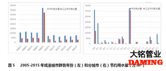 成渝城市群2005-2015年期間,除去2009年異常值外,各年份節(jié)約用水總量低于1億m³,工業(yè)節(jié)約用水占比為52.8%(見圖5左)。成渝城市群節(jié)約用水主要來自成都、自貢和重慶(占全部節(jié)約用水總量的67.33%);廣安、巴中、雅安沒有統(tǒng)計節(jié)約用水;工業(yè)用水節(jié)約占比前三位的城市分別是達州、瀘州和自貢;重慶市工業(yè)節(jié)約用水占比為3.5%(見圖5右)。