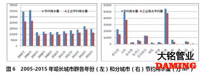 哈長城市群2005-2015年期間,2005年和2006年節(jié)約用水量達到高峰后,一直維持在每年1.5億噸左右(見圖6左)。節(jié)約用水總量前四位依次是吉林、大慶、哈爾濱和齊齊哈爾,占全部節(jié)約用水量的84.7%;工業(yè)用水節(jié)約總量占比為77.6%(見圖6右)。在節(jié)約用水?dāng)?shù)據(jù)統(tǒng)計方面,只有吉林省的遼源市和佳木斯市數(shù)據(jù)缺失嚴(yán)重,其他城市數(shù)據(jù)完整性較好。