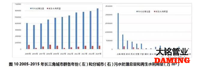 長三角城市群2005-2015年期間,污水處理總量持續(xù)增長,2015年是2005年的1.55倍。但再生水利用量并沒有顯著增長,再生水利用總量僅占污水處理總量的9%,各年份之間差異較大,總體呈現(xiàn)減少趨勢,2015年為2005年利用量的79%(見圖10左)。上海、南京和杭州的污水處理總量最大,僅上海市就占到全部總量的37%,三個城市總和占到全部總量的62.5%。南京市和蘇州市再生水利用量最大,分別占到全部總量的35%和23%。再生水利用較少的城市有上海、杭州、嘉興、紹興、泰州和臺州(見圖10右)。