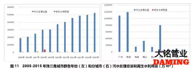 珠三角城市群2005-2015年期間,污水處理總量持續(xù)增加,但再生水利用量并沒有與之同比例增加,再生水利用總量占污水處理總量的占比僅為1.6%(見圖11左)。這可能是由于該地區(qū)雨水豐沛,污水處理后的水作為生態(tài)用水更為經(jīng)濟[1]。2008年珠三角城市群再生水利用量達到峰值,且主要來自東莞市和肇慶市(見圖11右)。