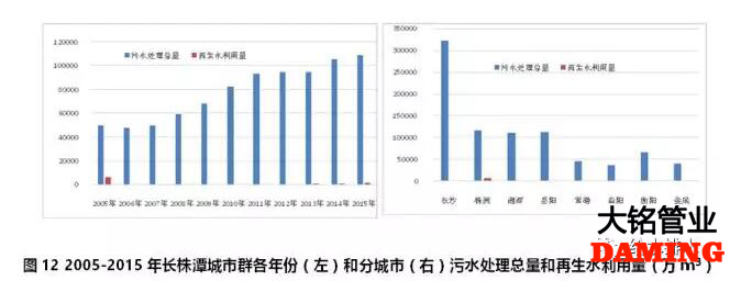 長株潭城市群2005-2015年期間,污水處理總量持續(xù)增加,2015年污水處理總量達到10億m³,是2005年的2.2倍。2002-2008年期間廢水排放總量基本與經(jīng)濟增長水平保持同步遞增趨勢,且廢水排放生產(chǎn)率快速提高,總體環(huán)境污染負(fù)荷較高。盡管長株潭城市群2005年至2010年期間工業(yè)廢水排放達標(biāo)率持續(xù)改善,但區(qū)域上中下游城市污水集中處理率分別為15.3%、31.8%、49.4%,水污染問題嚴(yán)重。2009年是長株潭城市群污水處理量提升的一個關(guān)鍵年份,2009年以后污水處理量大幅度提升,這可以有效改善區(qū)域生態(tài)環(huán)境資源承載能力。但再生水利用量沒有同比例增加,其用量僅為污水處理總量的1.2%(見圖12左)。除長沙和株洲外,湘潭、岳陽、常德、益陽、衡陽和婁底這六個城市均無再生水生產(chǎn)和利用行為(見圖12右)。研究表明,長株潭城市群2030年城市化率達到90%、第二產(chǎn)業(yè)和第三產(chǎn)業(yè)持續(xù)增長的態(tài)勢下,只有將污水處理率提高到100%、污水回用率提高到35%的條件下,才不會產(chǎn)生水資源供需缺口狀況[7]。提升城市群再生水利用率是實現(xiàn)水資源供需平衡的一個重要措施。