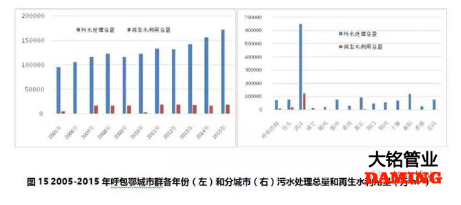 呼包鄂城市群2005-2015年期間,污水處理總量持續(xù)增加,2015年是2005年的1.79倍;再生水利用占污水處理總量的10.5%,2015年是2005年的3.5倍,2011年再生水利用量增長幅度很小(見圖15左)。再生水利用主要來自三個城市,武漢市、包頭市和呼和浩特市,占城市群全部再生水利用總量的97%,武漢市更是占到了81%,黃石和十堰市有很小比例的再生水利用(見圖15右)。
