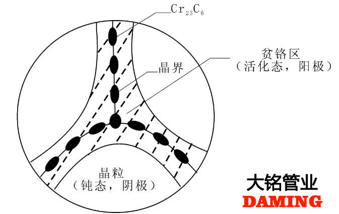 奧氏體不銹鋼在固溶處理時,如果冷卻速度過慢,隨著溫度下降,碳原子在基體中的溶解度下降,碳化物便會析出。并且碳原子特別容易與鉻結合,形成M23C6型碳化物,分布在晶界上,晶界發(fā)生貧鉻現(xiàn)象,發(fā)生敏化。奧氏體不銹鋼發(fā)生敏化以后,應在850ºC以上加熱,碳化物會固溶,再快速冷卻就能夠解決敏化問題。